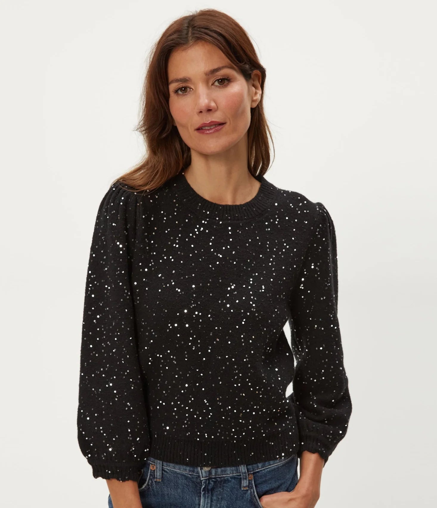 Cozy with a touch of sparkle, the Deanna Sweater is the soft-yet-stylish piece your wardrobe has been waiting for. Designed with a round neckline and 3/4 puff sleeves, it features allover sequin detailing that delivers just the right amount of glam. Perfect for dressing up your denim or adding a festive finish to a party skirt, this standout knit brings effortless shine to any outfit.
