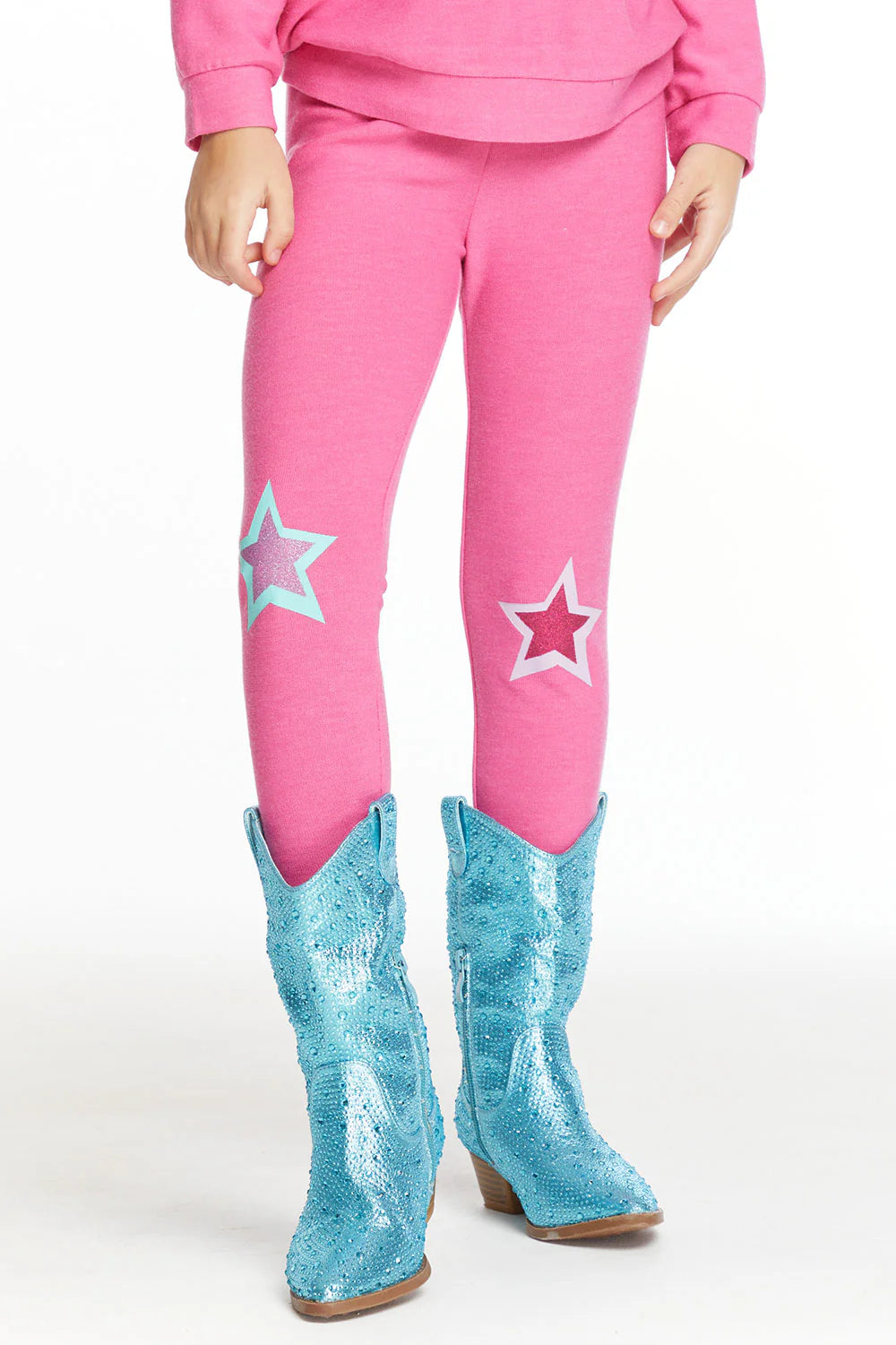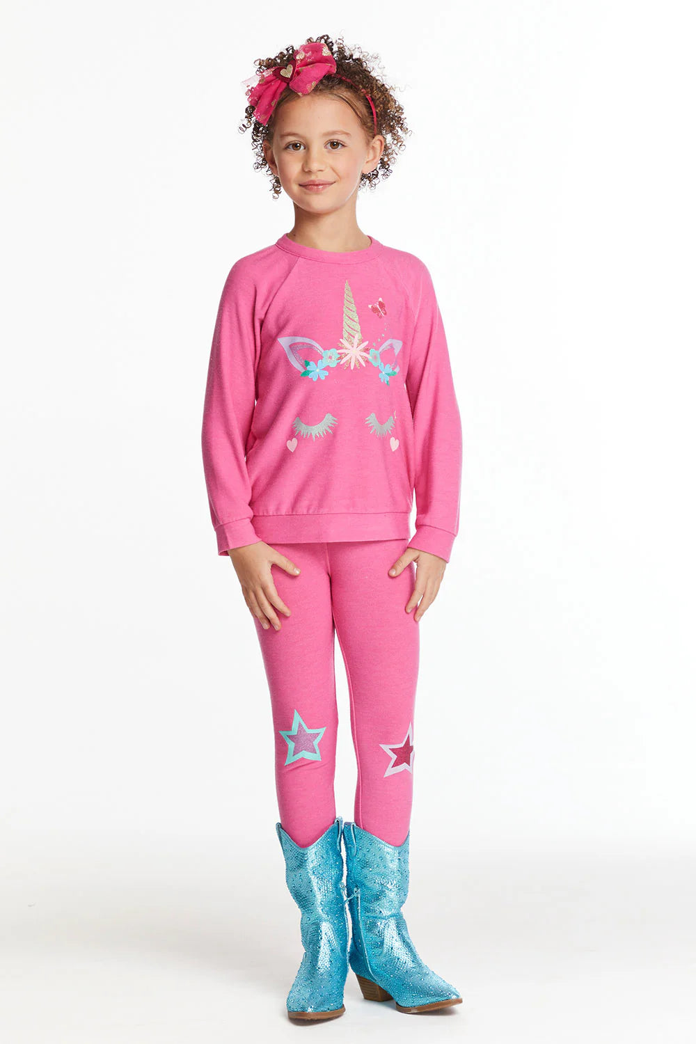 If she's all in on unicorns, she’ll adore this sweet love knit raglan pullover. In bright Rio pink, a minimalist unicorn winks her long eyelashes under a floral horn. Cozy cute, and utterly chic, it's sure to become a playground favorite. Paired with the bright stars legging.